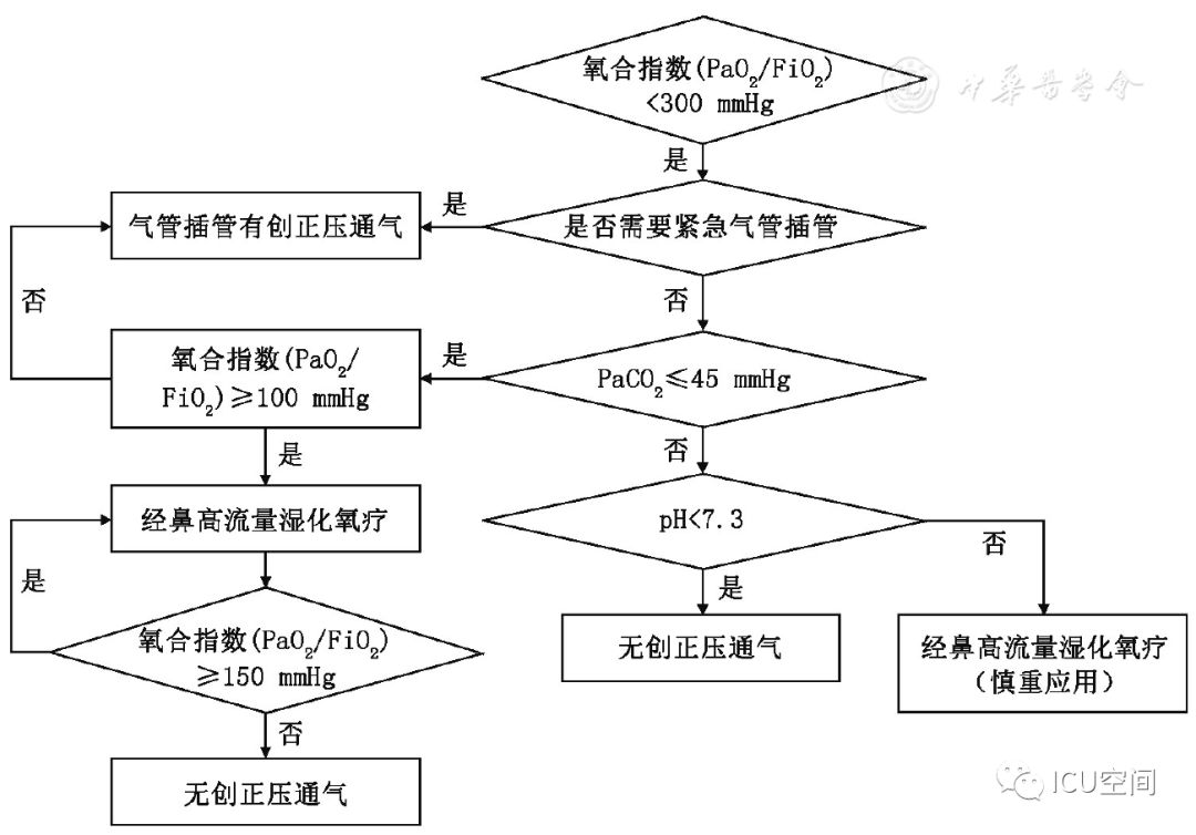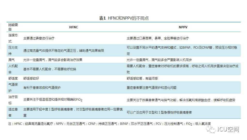 圖1 經(jīng)鼻高流量濕化氧療儀示意圖 人類(lèi)開(kāi)始氧氣治療的歷史可回溯到18世紀(jì)后葉,20世紀(jì)初即開(kāi)始應(yīng)用橡膠制作的鼻導(dǎo)管進(jìn)行氧療[4]。1987年美國(guó)研發(fā)了最高流量可達(dá)20 L/min的氧療加溫濕化裝置MT-1000,應(yīng)用于囊性肺纖維化等患者氧療促進(jìn)下呼吸道分泌物排出。近10年來(lái),HFNC進(jìn)入快速發(fā)展和臨床廣泛應(yīng)用階段,國(guó)際主流HFNC裝置都是采用無(wú)創(chuàng)呼吸機(jī)的工作原理:用空氧混合器進(jìn)行空氧混合,吸入氧濃度(FiO2)為21%~100%,應(yīng)用渦輪提供高流量的氣體,采用呼吸機(jī)應(yīng)用的加溫加濕器和管路加熱導(dǎo)絲對(duì)吸入氣體進(jìn)行全程加溫加濕,并通過(guò)近患者端實(shí)時(shí)監(jiān)測(cè)溫度和氧濃度進(jìn)行動(dòng)態(tài)調(diào)控。另外,部分呼吸機(jī)廠家在有創(chuàng)和無(wú)創(chuàng)呼吸機(jī)上設(shè)置了HFNC功能,進(jìn)一步拓展了呼吸機(jī)的臨床適用范圍,這也是未來(lái)的發(fā)展方向[5]。國(guó)內(nèi)HFNC的歷史僅有5年左右,在前期仿制國(guó)外HFNC的基礎(chǔ)上進(jìn)行創(chuàng)新,在很短的時(shí)間內(nèi)形成自己的特色,如可自動(dòng)調(diào)節(jié)和精確調(diào)控FiO2(21%~100%)、溫度控制精度可達(dá)到±1 ℃、呼吸管路采用免消毒氣路技術(shù)等。 二、HFNC設(shè)備的結(jié)構(gòu)特點(diǎn)及其工作原理 (一)HFNC的結(jié)構(gòu)特點(diǎn) HFNC按其結(jié)構(gòu)特點(diǎn)可分為3大組成部分。 (1)氣體的空氧混合部分:其作用是將空氣和氧氣按預(yù)設(shè)氧濃度在渦輪前進(jìn)行混合。氧濃度調(diào)控有2種方法,一種是通過(guò)浮標(biāo)式氧氣流量計(jì)調(diào)節(jié)氧氣流量實(shí)現(xiàn)對(duì)氧濃度的控制,該方法無(wú)法預(yù)設(shè)氧濃度,只能通過(guò)調(diào)節(jié)氧氣流量產(chǎn)生實(shí)際的FiO2;一種是微型比例閥和超聲氧濃度傳感器實(shí)現(xiàn)對(duì)氧濃度的控制,可以預(yù)設(shè)FiO2。 (2)氣體的加溫濕化部分:其作用是將空氧混合后的氣體進(jìn)行加溫濕化。 (3)氣體的輸送部分:其作用是保證已完成加溫濕化的空氧混合氣體以恒溫恒濕恒流速的方式輸送至患者端。高流量濕化氧療儀與患者連接部分為高流量鼻塞,高流量鼻塞的尖端呈斜面型的出口,質(zhì)地柔軟,用一個(gè)具有彈性可調(diào)節(jié)的過(guò)耳頭帶固定于患者面部。 (二)HFNC的生理學(xué)機(jī)制 HFNC通過(guò)輸送高流速氣體的方式,可以維持一定水平的PEEP,維持肺泡開(kāi)放,有利于呼氣末肺泡復(fù)張和氣血交換。Corley等[6]通過(guò)使用電阻抗斷層掃描(EIT)測(cè)量心臟手術(shù)后肺容積的生理學(xué)研究證明了HFNC可促進(jìn)呼氣末肺容積增加,表明HFNC通過(guò)高流量產(chǎn)生的PEEP作用促進(jìn)肺復(fù)張。有研究結(jié)果顯示,HFNC流量每增加10 L/min,患者咽腔PEEP就增加0.5~1 cmH2O(1 cmH2O=0.098 kPa)[7]。流量增加到60 L/min時(shí),閉口的女性受試者咽腔PEEP可達(dá)到8.7 cmH2O左右,男性為5.4 cmH2O;張口呼吸情況下女性為3.1 cmH2O,男性為2.6 cmH2O左右。但值得注意的是,由于HFNC允許大量漏氣,患者若張口呼吸必然導(dǎo)致PEEP水平不穩(wěn)定[6]。 HFNC通過(guò)為患者提供恒定的、可調(diào)節(jié)的高流速空氧混合氣體,沖刷患者呼氣末殘留在鼻腔、口腔及咽部的解剖無(wú)效腔的氣體,可明顯減少患者下一次吸氣時(shí)吸入的CO2的含量[8]。M?ller等[9]通過(guò)81 mKr氣體測(cè)定HFNC對(duì)10名健康人鼻咽部和3例氣管切開(kāi)患者CO2的清除率,發(fā)現(xiàn)CO2清除率和HFNC的氣體流速和佩戴時(shí)間直接相關(guān)。 HFNC主要關(guān)注于提供相對(duì)精確的恒溫和恒濕的高流量氧療,因而能夠更符合人體生理情況下呼吸道的氣體溫度及濕度,降低醫(yī)用干冷氣體對(duì)上下呼吸道黏液纖毛系統(tǒng)功能和黏膜的影響[10]。與普通氧療相比,使用HFNC可以明顯降低患者鼻、口、咽喉的干燥評(píng)分,有助于稀釋痰液和排痰,修復(fù)和維持人呼吸道上皮細(xì)胞和纖毛的結(jié)構(gòu)和功能,提高患者的舒適度,降低下呼吸道感染的發(fā)生幾率[6,11] 鼻咽腔通過(guò)提供較大的表面積對(duì)吸入氣體進(jìn)行濕化和溫化,但同時(shí)吸入氣體之間的摩擦?xí)?duì)氣流產(chǎn)生明顯的阻力[12]。HFNC可以提供滿足患者吸氣流速需求、恒溫恒濕的高流量氣體,患者在吸氣時(shí)不需要用力吸氣也不需要對(duì)吸入氣體進(jìn)行加溫加濕,這樣不僅降低吸氣阻力,同時(shí)避免患者對(duì)吸入氣體進(jìn)行溫化濕化所需的代謝消耗,減少患者的呼吸做功[13,14]。而且與常規(guī)氧療輸出的低流量氧氣方式相比,HFNC能提供符合或超過(guò)患者所需的吸氣峰流速,減少了吸氣時(shí)空氣的稀釋作用,使得吸入氧氣的濃度不會(huì)受到患者的呼吸頻率、吸氣流速、呼吸形態(tài)等因素的影響,為患者提供精確穩(wěn)定的吸氧濃度,有利于改善患者氧合[6]?;颊叩脱鯛顟B(tài)得到改善,呼吸更舒適,自主用力呼吸減弱,加之PEEP作用,呼吸功會(huì)隨之降低[15]。 三、HFNC與NPPV的異同點(diǎn) HFNC和NPPV在治療原理上存在許多相似之處。從工作原理上看,都是電動(dòng)渦輪機(jī)驅(qū)動(dòng)形成高速氣流,通過(guò)電磁閥實(shí)現(xiàn)流量可控,氣流均可加溫加濕,都是傳統(tǒng)意義上