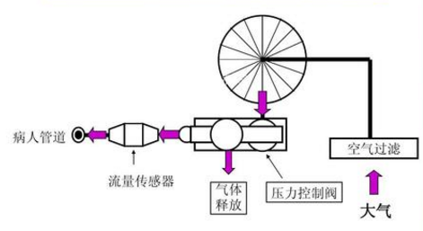 流量傳感器將測量到的實際值饋送到電子控制部分與面板設置值比較,利用兩者間的誤差控制伺服閥門來調(diào)節(jié)吸入和呼出氣體流量;