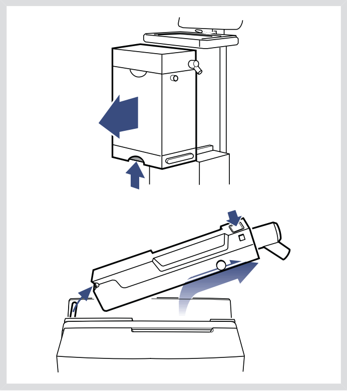 - 按住呼氣封閉盒上的按鈕,向上傾斜呼氣封閉盒直到其脫出。