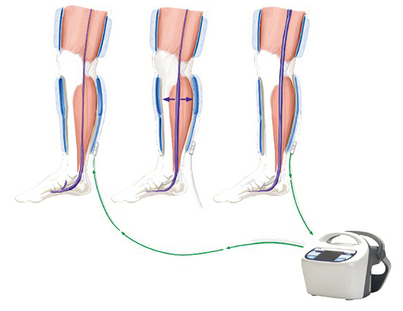 ②圓周壓力:通過(guò)充氣腿套對(duì)腿部進(jìn)行圓周壓力,有效清除靜脈瓣后血液瘀積;