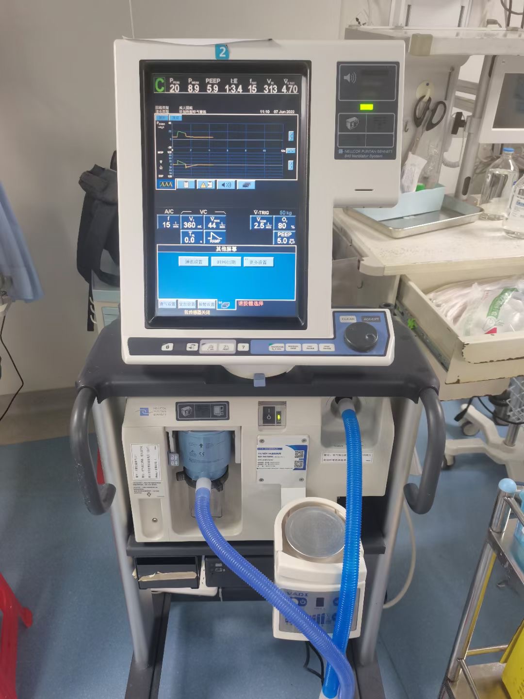 (5) 呼吸機(jī)接上病人,在上半屏幕的頂部會顯示呼吸機(jī)檢測到的病人數(shù)據(jù),呼吸機(jī)所有的設(shè)置值將在下半屏幕顯示。