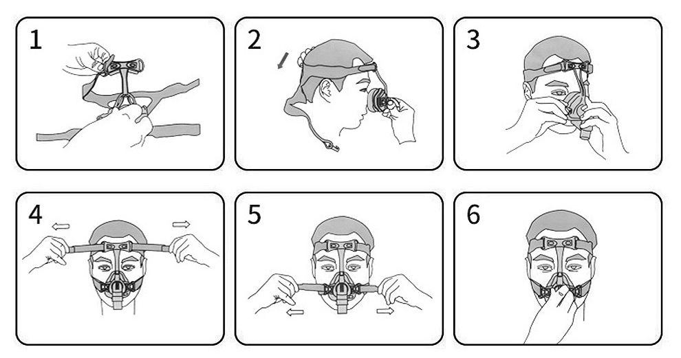 在坐姿時,手扶住面罩貼合面部,然后調整頭帶,調整上、下頭帶讓前額墊及面罩輕輕貼合在前額和臉頰上,保持上下頭帶平行。