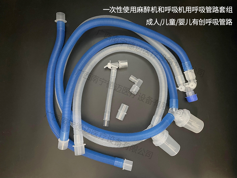 一次性使用麻醉機和呼吸機用呼吸管路套組包括單管路型和雙管路型,由波紋管、接頭(直型、Y型、L型、T型)、轉換接頭、集水杯(選配)、壓力管(選配)、延長管(選配)、單向閥(選配)和儲氣囊(選配)組成。以無菌形式提供,經環(huán)氧乙烷滅菌,一次性使用。